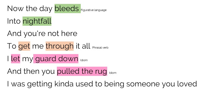 Este es el estribillo de la canción Someone you Loved de Lewis Capaldi. Como veis, encontramos varias clases de vocabulario, incluyendo lenguaje figurativo y poético («the day bleeds», el día sangra, refiriéndose al atardecer). Al leer y comprender la letra y poder cantarla y escucharla, algo que en esencia es entretenido y disfrutable, es mucho más probable que retengas estas palabras, frases y usos en tu memoria.