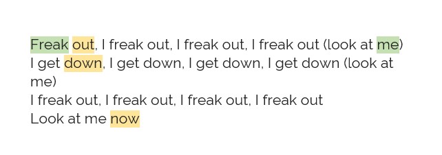 Busca la letra de una canción que te guste y busca diferentes sonidos (vocales, diptongos, combinaciones de consonantes) en la letra. Trata de encontrar palabras con ejemplos de un mismo sonido. Aquí tienes un ejemplo de la canción «Stupid Love» de Lady Gaga. He señalado ejemplos de un mismo sonido en distintas palabras. Esto te puede ayudar a ver como a pesar de no escribirse de la misma manera, las palabras pueden compartir sonidos. Puedes ayudarte del Diccionario Fonético Internacional (en inglés International Phonetic Alphabet, IPA).