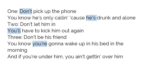 Encuentra la letra de una canción que te guste. Aquí he elegido «New Rules» de Dua Lipa. Busca ejemplos de contracciones y señálalos. Escucha la canción y haz el esfuerzo consciente de pronunciar las contracciones como lo haga el o la artista.