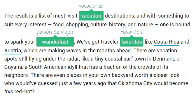 Para evitar tener que hacerlo, quiero compartir contigo un descubrimiento que he hecho recientemente: Readlang. Readlang es una extensión para Chrome que se integra en cualquier página web que visites que contenga texto, y te permite traducir cualquier palabra en el momento, solo haciendo clic. No solo podrás traducir palabras sino también grupos de palabras y frases. La versión gratuita (que está muy bien porque te permite usar casi todas las funcionalidades) te permite traducir texto en grupos de hasta 6 palabras. En la versión de pago (5$ al mes) podrás traducir grupos de hasta 12 palabras.